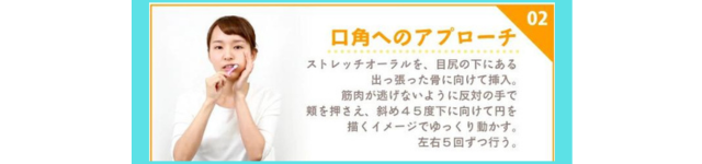 ストレッチオーラルを目尻の下にある出っ張った骨に向けて挿入。筋肉が逃げないよう反対の手でほほをおさえ、斜め45度下に向けて円を描くイメージでゆっくりと動かす。左右5回ずつ行う。